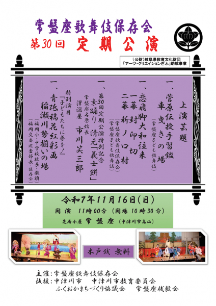 11/16(日)、中津川市指定有形文化財「常盤座」(中津川市高山)にて、常盤座歌舞伎保存会第30回定期公演が開催されます。