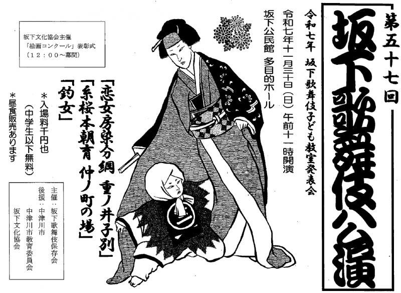 11/30(日)、坂下公民館(中津川市坂下)にて、第57回坂下歌舞伎公演が開催されます。令和7年坂下歌舞伎子ども教室発表会も兼ねており、どの演目にも子どもたちが登場します。