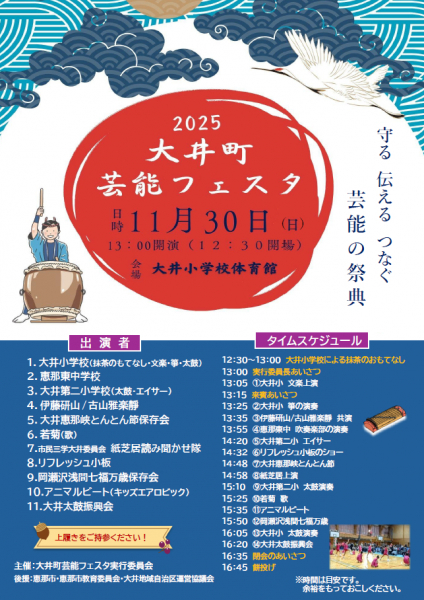 11/30(日)、恵那市立大井小学校体育館にて、「2025大井町芸能フェスタ」が開催されます。その中で大井文楽保存会の指導による大井小学校の文楽上演が行われます。