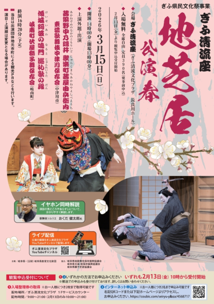 3月15日(日)、ぎふ清流座(ぎふ清流文化プラザ 長良川ホール)にて、「ぎふ清流座 地芝居公演 春」を開催します。本公演では地歌舞伎と獅子芝居の2団体が出演。歌舞伎ソムリエおくだ健太郎氏によるイヤホン同時解説や、ぎふ清流文化プラザYouTubeチャンネルでのライブ配信も行います。